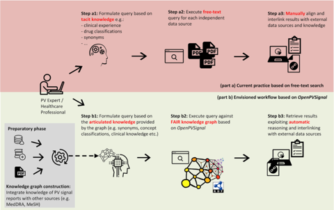 In particular, OpenPVSignal supports a well-defined processing workflow enabling the construction of a “knowledge graph”, which can be queried by pharmacovigilance professionals. The knowledge graph is instantiated using the content of the unstructured text within signals and is linked to other relevant data through references to external terminologies and thesauri, such as the Anatomical Therapeutic Chemical (ATC) Classification System, the Medical Dictionary for Regulatory Activities (MedDRA®), Medical Subject Headings (MeSH), and others. This way, OpenPVSignal supports efficient data integration and browsing, minimises end-user effort, prevents errors and missing information links, and enables automatic inferencing using linked data.