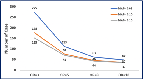 Saliva is a biological fluid from which we can extract DNA for such studies. It can be collected easily from patients, stored without refrigeration, and remains stable for years. So it’s definitely possible to obtain biological samples along with detailed and thorough reports of ADRs as part of the data collection process. Given the ease of collection of this kind of data, why isn’t more work being done to define this new joint field of study? That is, a pharmacogenomic linking of gene variants known to affect a drug’s pharmacokinetic and/or pharmacodynamic properties with the careful and rigorous data collection procedures of pharmacovigilance? The numbers of patients needed for such studies are not unreasonable to get started and effect sizes are generally quite strong (odds ratios of three or more). These studies are powered for detecting genetic variant frequencies, known as minor allele frequencies (MAF). A MAF of at least five percent makes the most sense since rarer variants would be hard to find even with large sample sizes. As you increase the frequency of the genetic variant responsible for a given ADR, the sample size goes down, as can be seen in figure 1.