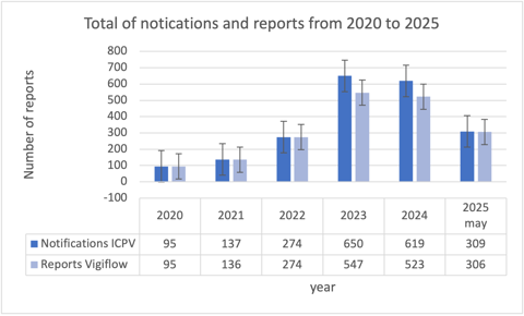 Aside from an increase in the number of ADR reports submitted to VigiFlow, the overall average of incidence reports per year has steadily increased almost threefold from 5.21% in 2020, when the ICPV was created, to 14.38% in 2025 (see Table).