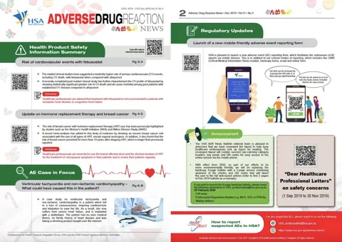 The Health Sciences Authority’s (HSA) Adverse Drug Reaction (ADR) News Bulletin is a key communication tool to inform healthcare professionals on HSA’s regulatory assessments of safety signals and their outcomes. It is also used to promote adverse event (AE) reporting by healthcare professionals. It has been in publication since 1998 with three issues yearly.