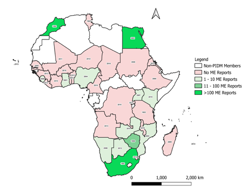 From the study, there were 4,205 ME reports from African countries submitted to VigiBase. These reports represented only 0.4% of ME reports submitted globally from other countries in the database. It was found that out of the 37 African countries that were members of the WHO Programme for International Drug Monitoring (WHO PIDM) as of December 2020, only 15 (40.5%) had contributed ME reports to VigiBase with 99% (3,874) of these coming from three countries, namely Egypt, Morocco, and South Africa. The 15 African countries that have submitted ME reports to VigiBase as of December 2020, the number of ME reports submitted, and the year of joining the WHO PIDM is shown in Figure 1.