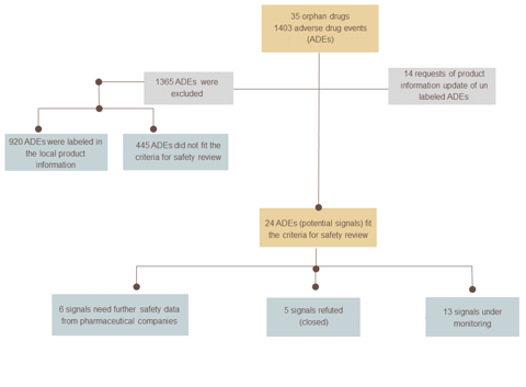 The project comprised the evaluation of a total of 35 orphan medications registered by the SFDA, revealing 1403 reported adverse events linked to these medications retrieved from the AdisInsight database. As a result of the assessment process, requests have been made to update the local product information of 14 orphan drugs from pharmaceutical companies. Additionally, we performed 20 comprehensive drug safety reviews to assess 24 potential safety signals. The recommendations stemming from these reviews included requests for further safety data for six signals, continued monitoring of 13 signals, and the discontinuation of monitoring five other signals.